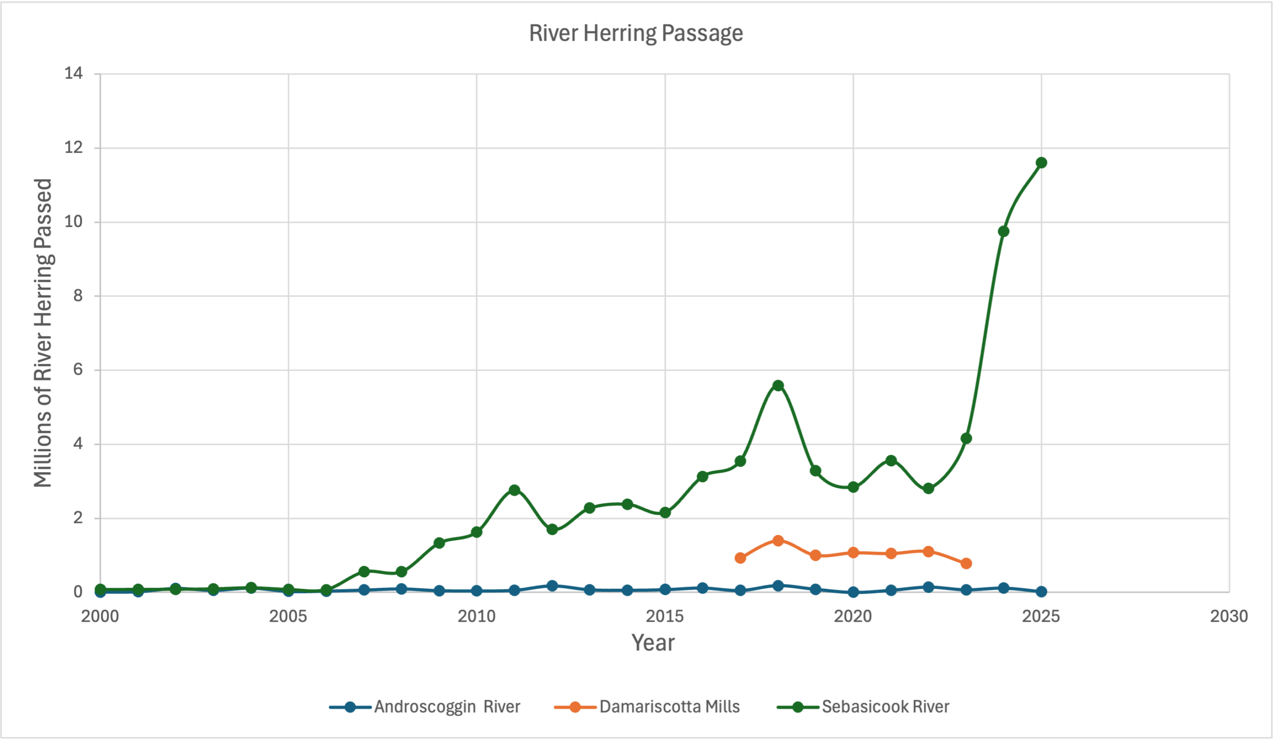 Figure 1. River herring passage at Brunswick on the Androscoggin River, Damariscotta Mills, and Benton Falls on the Sebasticook River between 2000-2023 in millions of fish passed. Estimates of potential river herring production are 2.7 million for the Androscoggin, 1 million for Damariscotta Mills, and 5.3 million for the Sebasticook. By 2009, two dams had been removed and three fish lifts installed on the remaining dams in the Sebasticook/Kennebec system allowing passage of millions of river herring. By 2017, the Damariscotta Mills fishway had been reconstructed allowing passage of ~1 million alewives each year into a single lake. The Androscoggin, however, has been left behind with inadequate fish passage. The fishway at Brunswick has only passed 71,087 river herring on average each year between 2000 and 2023, only 2.6% of its potential productivity. Also, very few American shad are able to navigate the Brunswick fishway (data not shown).