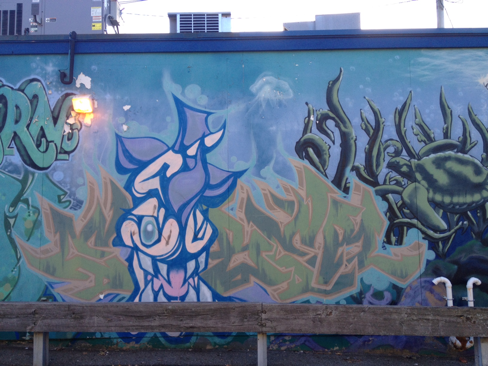 We continue our walk. Approaching the West End, the landscape transforms. We confront a pocket of strip mall, fast food joints, and ethnic markets. Here I find perhaps the best “graffiti” in Portland: an undersea mural across the walls of the Dogfish Cafe. It had the clash of three dimensional graffiti fonts, a crab against tendrils of kelp, and an unidentifiable sea creature against a gradient of blues and drowned clouds.