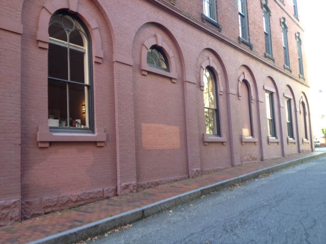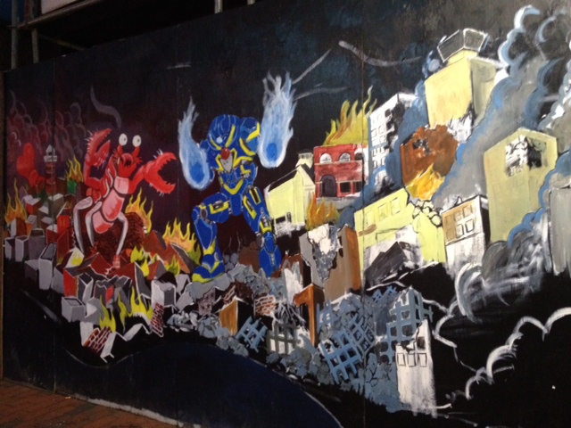 We head up the hill back around to Congress Street, the new arts district that had encroached on one of my mappers’ (Tom; Map #2) fond memories of the street ten years ago, when Strange Maine had just opened. Congress had been lined with pawn and junk shops, and places like Paul’s convenient store and Joe’s smoke shop. Ten years later, my eyes are meeting beautiful examples of graffiti, the kind better defined as street art. There is a red, distorted “Nosh” dripping with blue splayed against the black facade of NOSH restaurant. Where Congress and High streets intersect, there is a curved wall of plywood with maze-like clouds, black “windows” looking into an sunset, and a crab battling a transformer atop a burning city.