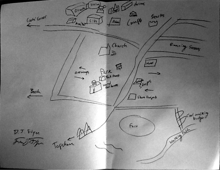 Duncan “DJ” Flynn was the artist behind this map. He is a senior at Bowdoin who also hails from northern Maine. The basis of his inclusions draw upon three main factors: the places where he attends class, the places where he goes running, and the places that he drives to. All of his inclusions are either located on campus or within the area roughly spanning one mile south of the campus. He included many specific locations, including Searles Hall and Fort Andross, which he includes by name. Other spots, such as “running streets” or “shops,” are left more ambiguous but are still nonetheas important to his map. His inclusion of driving routes are also often paired with landmarks, such as the church at the southern corner of campus and the bridge over the Androscoggin River towards Topsham. Noticeably he left out the northern part of campus, citing that “he would have included it but ran out of space on the page.”