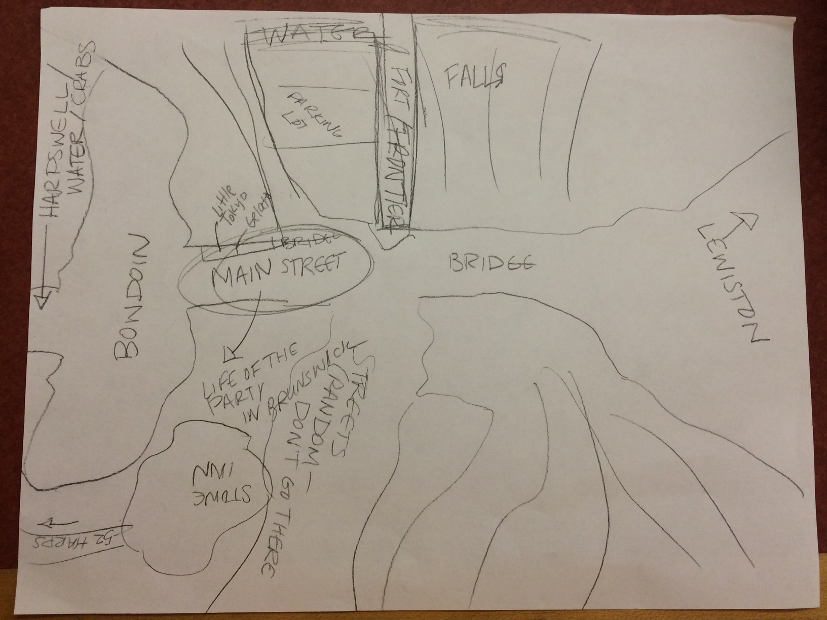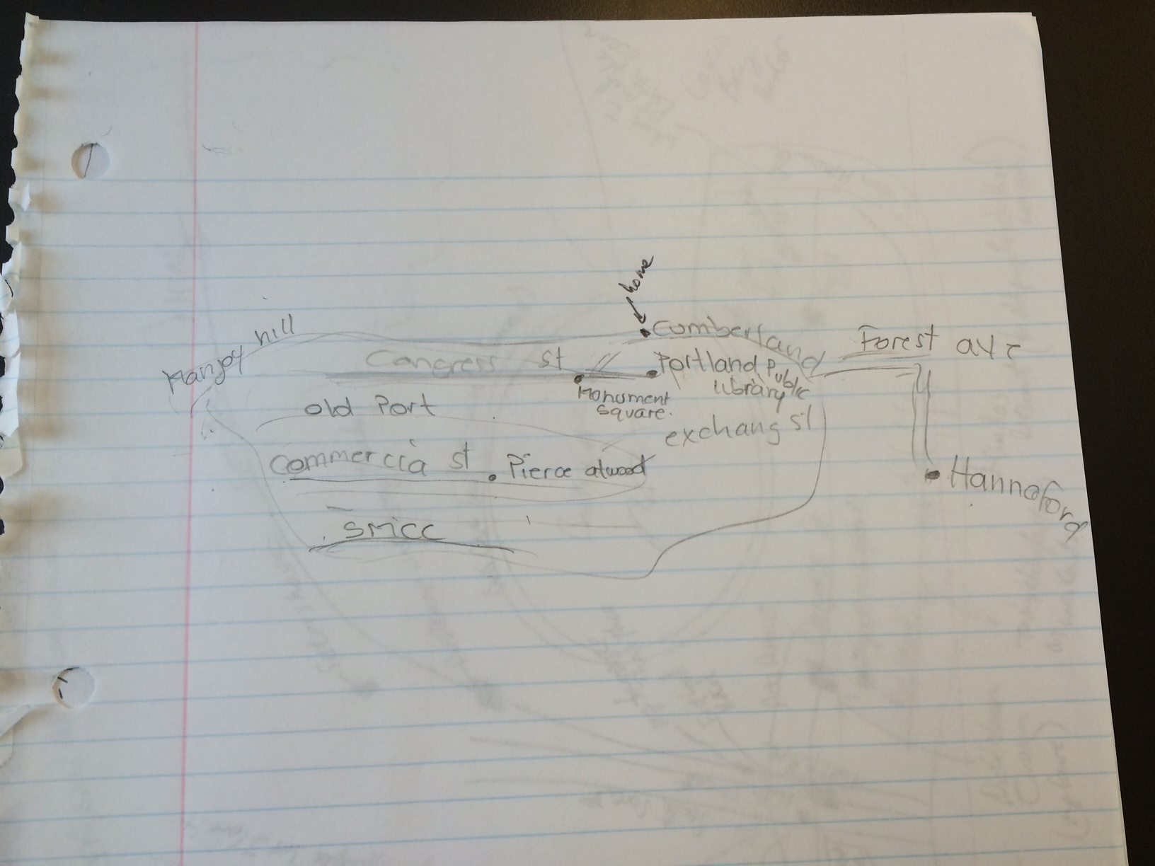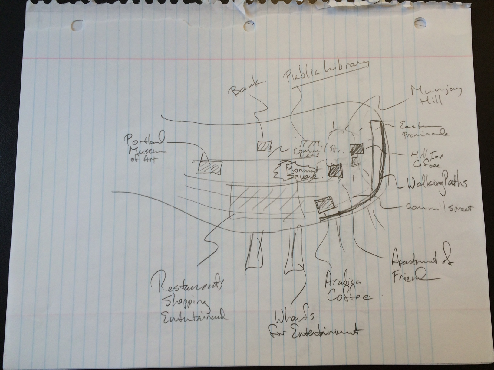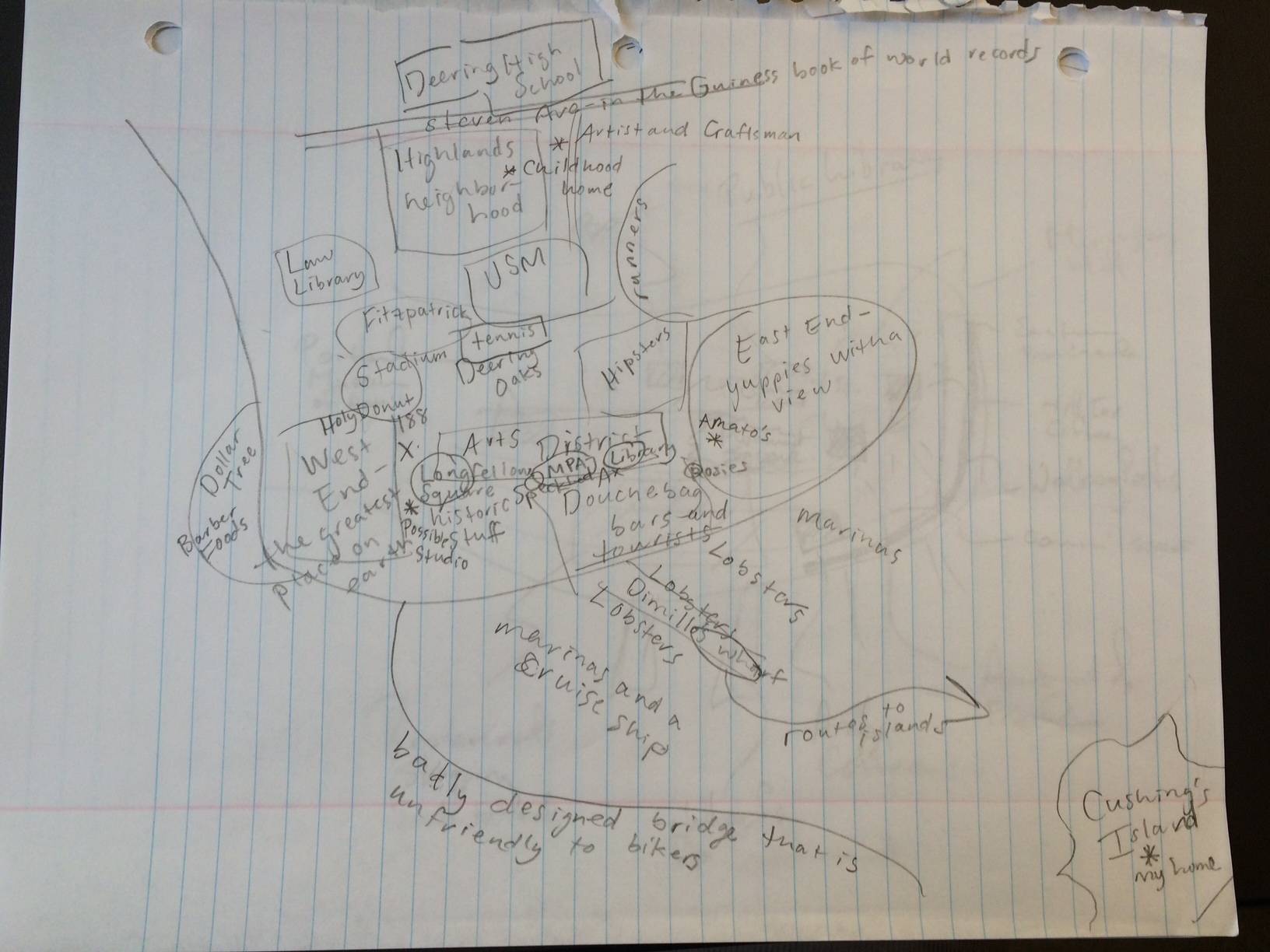 The mental maps demonstrated very different views of Portland, which was not surprising considering that I collected maps from people of many different backgrounds. The first person I collected a map from had spent far more time living in Portland than the others and I saw this in her map through her brutally honest descriptions of neighborhoods (e.g. Old Port = “douchebag bars and tourists”). The participants with less experience living in the city, seemed to provide less social commentary. Those who had the least amount of experience also seemed to have most difficulty drawing a detailed map which makes sense as well. I did find all of their smart city technology suggestions to be very helpful. Wi-Fi and the bus system were both technologies I was concerned about and these both came up. I also found the bike sharing suggestion to be particularly helpful and this is something I will definitely consider.