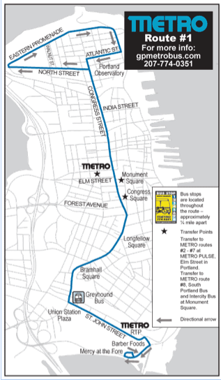Google Map of Portland City Bus Route #1 – does not show exact route but shows where the stops are (if you hover your mouse over the bus stop symbols then a window pops up describing which Metro Routes stop there)