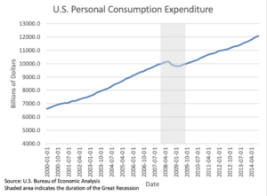To highlight the effect of the housing market collapse on consumer spending, we focus on both the U.S. house price index and the U.S. personal consumption expenditure between 2000 and 2014. The graph below shows data from the U.S. Bureau of Economic Analysis, showing personal consumption expenditures from 2000 to 2014. In 2008, there was a decrease in personal consumption. Specifically, personal consumption expenditures dropped from a high of $10.159billion in June 2008 to a low of $9.805 billion in April 2009. This represents a significant decrease in consumer spending during the peak of the Great Recession. The drop in consumption can be attributed to an overall economic contraction, which was triggered by the housing market collapse. Additionally, it is noticeable that consumption did not return to its previous pre-recessionary levels until April 2010, showcasing a prolonged decrease in consumption.