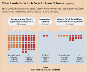 Before Hurricane Katrina hit in August 2005, New Orleans’ 124 public schools were already opened (Dreilinger, 2019). The majority of these schools were under the Orleans Public School Board the others were either controlled by the Recovery School District or under a charter school management organization (Dreilinger, 2019). Established prior to the Hurricane, the
