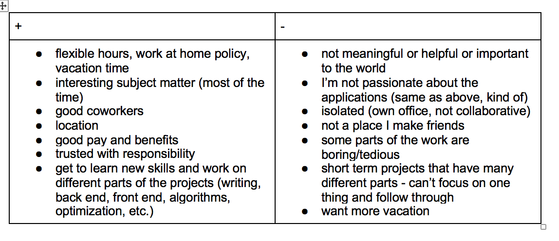 “I’m thinking of finding a new job. I like my job, but it’s not what I want to do forever, and obviously it would be better to be in a job so great that I would want to do forever. But what makes a job great? This month, I’m exploring what I want in a job, starting with some high ideals, then translating those ideals into concrete characteristics that I can either measure or ask about in interviews, and finally hopefully coming up with some realistic ideas of jobs I would want to apply for (Camille 2018).”